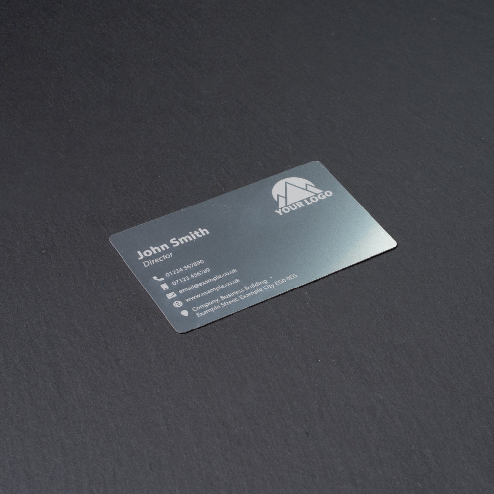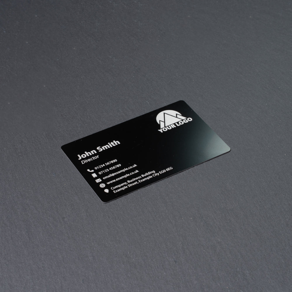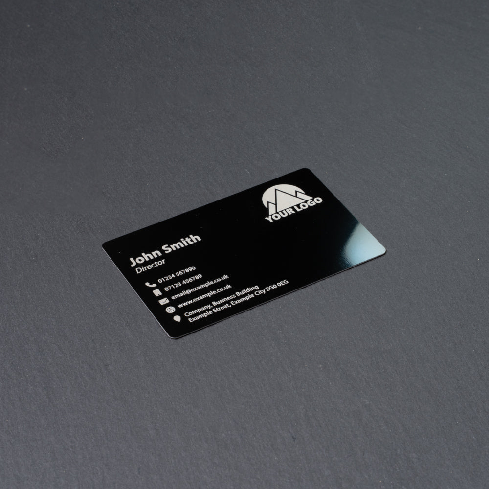 0.2mm and 0.4mm Thick Metal Engraved Business Cards available in Gold, Matt Black and Gloss Black.